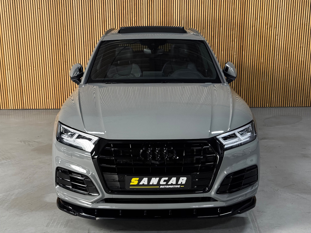 Prachtige Audi Q5 55 TFSI e S-competition S line plug-in hybrid met 367 pk, slechts 120.246 km op de teller en afkomstig uit 2020. Uitgevoerd in de stijlvolle kleur Quantum Grijs parelmoer met zwarte accenten, rode remzadels en 20-inch Audi Sport lichtmetalen velgen (5-arm Rotor, antraciet-zwart, glansgedraaid).