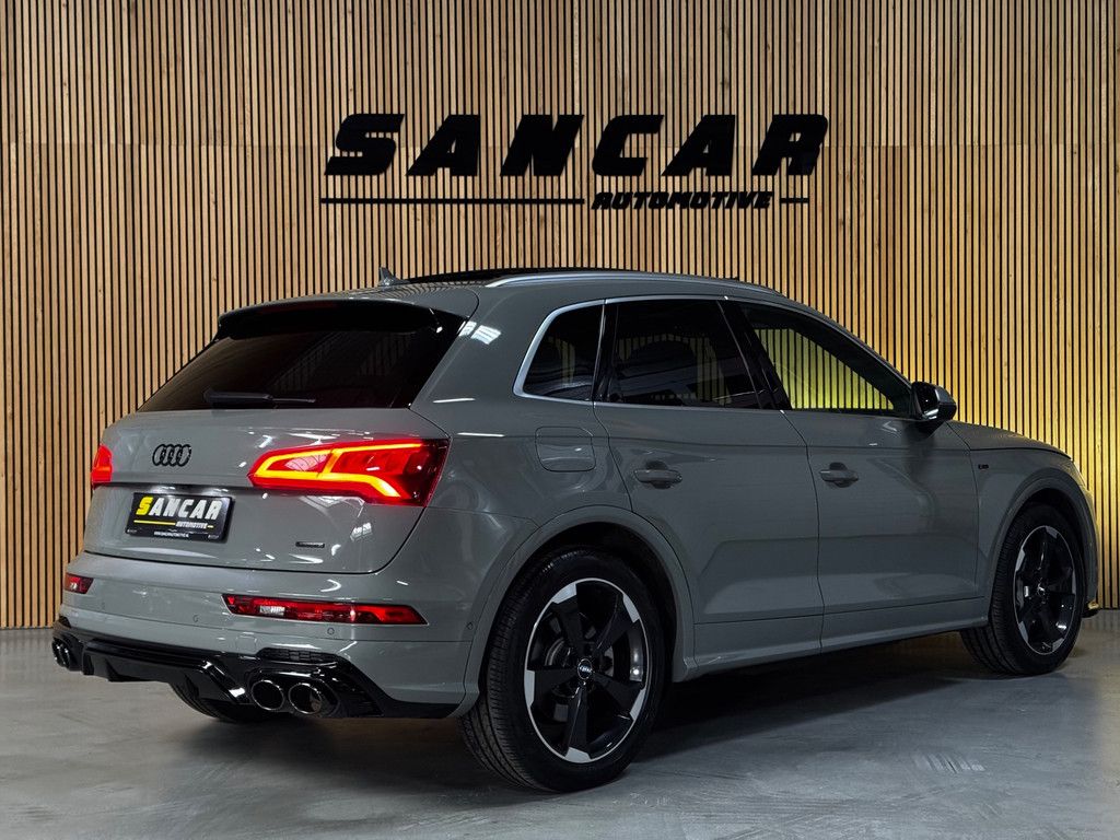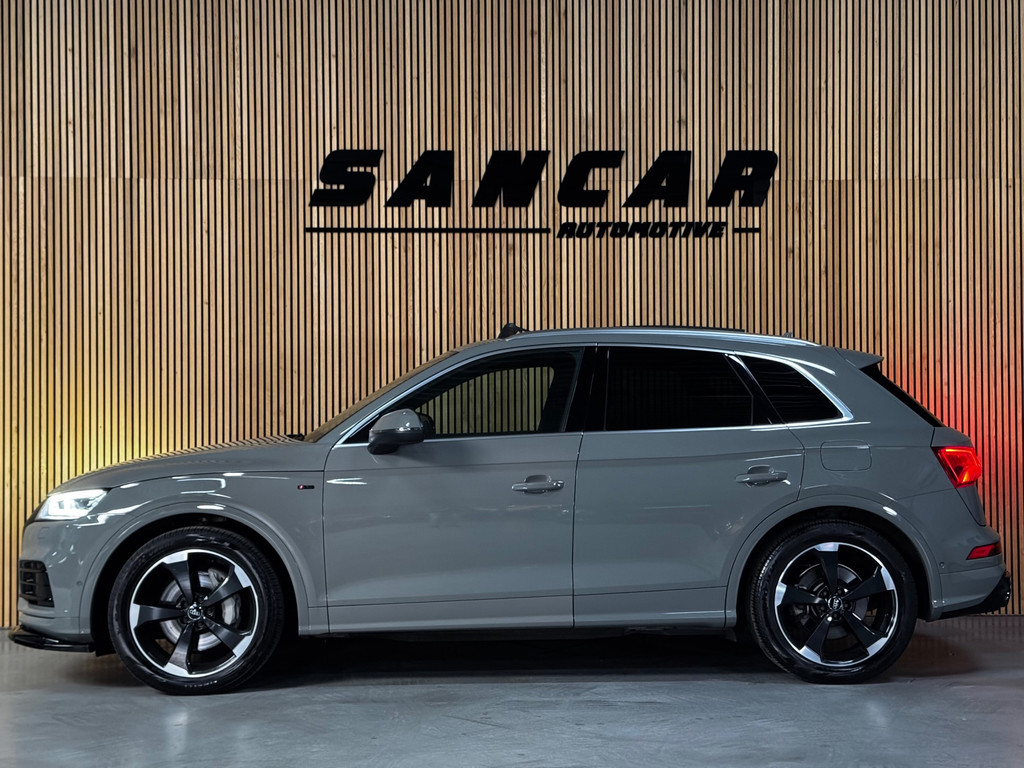 Prachtige Audi Q5 55 TFSI e S-competition S line plug-in hybrid met 367 pk, slechts 120.246 km op de teller en afkomstig uit 2020. Uitgevoerd in de stijlvolle kleur Quantum Grijs parelmoer met zwarte accenten, rode remzadels en 20-inch Audi Sport lichtmetalen velgen (5-arm Rotor, antraciet-zwart, glansgedraaid).